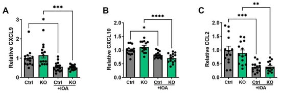 Plasma concentrations of CXCL9 (A), CXCL10 (B), and CCL2 (C) in C57BL/6J-ENPP2fl/fl (Ctrl) and C57BL/6J-ENPP2fl/flAdipoq-Cre+ (KO) mice with or without IOA-289 (IOA) treatment. The average value of the control group is used for normalization. n = 14 per group, * p < 0.05, ** p < 0.01, *** p < 0.001, **** p < 0.0001.