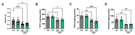 Tumor concentrations of LIF (A), TGFβ1 (B), TGFβ2 (C), and prolactin (D) in C57BL/6J-ENPP2fl/fl (Ctrl) and C57BL/6J-ENPP2fl/flAdipoq-Cre+ (KO) mice with or without IOA-289 (IOA) treatment. n = 14 per group for LIF, the average value of the control group was used for normalization. n = 5 per group for TGFβ1, TGFβ2, and prolactin. * p < 0.05, ** p < 0.01, *** p < 0.001.