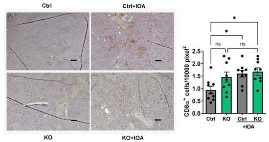 IHC staining and quantification of CD8α+ T-cells in the tumors of C57BL/6J-ENPP2fl/fl (Ctrl) and C57BL/6J-ENPP2fl/flAdipoq-Cre+ (KO) mice with or without IOA-289 (IOA) treatment. Scale bar = 100 μm. n = 9, * p < 0.05, not significant: p > 0.05.