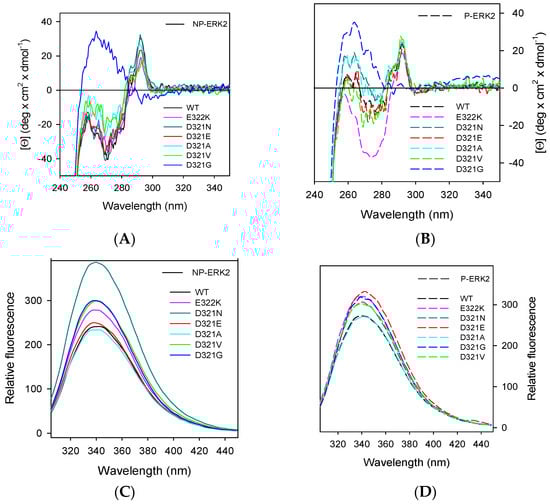The fluorescence spectra of the P-ERK2 D321E variant was centered at 343 nm, and it was significantly different from that of the wild-type (Figure 4D), suggesting changes in the tryptophan environment. For the NP-ERK2 variants, only D321N showed a slight increase in the relative fluorescence intensity (Figure 4C); no significant differences were detected for all the other variants.