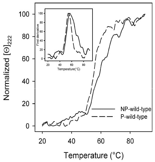 A missense mutation may lead to significant structural alterations that may change the stability of the protein and impair the protein function [,]. To provide insights into the effect of missense mutations on protein stability, we analyzed the thermal stability of the NP-ERK2 and P-ERK2 wild-types and variants by continuously monitoring the changes of the molar ellipticity at 222 nm in the temperature range between 20 °C and 90 °C (Figure 5 and Supplementary Figure S3). The irreversible thermal denaturation occurred in a transition apparently cooperative. The melting temperature (Tm), corresponding to the midpoint of the denaturation process, was calculated by plotting the first derivative of the molar ellipticity values as a function of temperature. The thermal transition of the NP-ERK2 wild-type (Tm = 55.0 °C) was less cooperative than that of the P-ERK2 (Tm = 56.0 °C) (Figure 5).