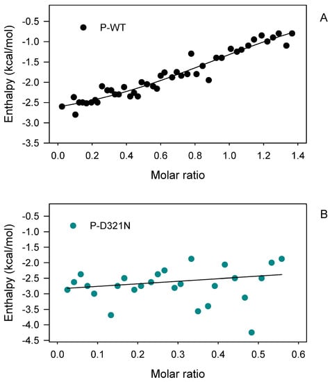 The D321N variant shows an increased cellular activity in cells and evades inactivation catalyzed by phosphatases, such as DUSP6 []. DUSP6 plays a crucial tumor-suppressive role via pivotal negative-feedback regulation of the ERK2 in the MAPK signaling pathway [,]. The KIM peptide GIMLRRLQKGNLPVRAL of DUSP6 directly binds to the ERK2 CD-site. The ITC titration between the P-ERK2 wild-type and the KIM peptide DUSP6 showed a Kd of 14.4 µM (Figure 6). This analysis shows an enthalpy-driven interaction between hydrogen-bonding and van der Waals interactions. The P-ERK2 D321N showed no detectable binding heat with the KIM of DUSP6, suggesting that the loss of the aspartate negative charge in the asparagine variant prevents any binding interaction with KIM [].