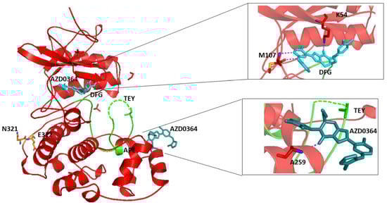 The human phosphorylated-ERK2 (P-ERK2) D321N (in red) bound to inhibitor AZD0364 (in cyan). In green, the activation loop that begins with the sequence DFG and ends with the sequence APE. The dotted line underlines the undefined region of the three TEY amino acids, important for the activation of ERK2. In cyan, the compound AZD0364 that binds in two opposite regions the mutant D321N.