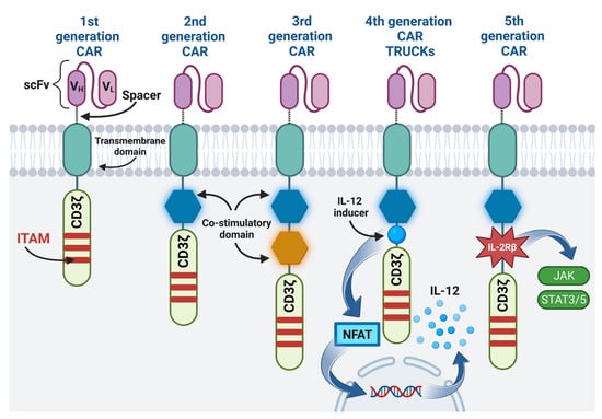 The structure of different CAR generations: The first generation contains only CD3ζ cytoplasmic domain with three immunoreceptor tyrosine-based activation motifs (ITAMs). The co-stimulatory domain is added in the second generation. The third generation contains two co-stimulatory domains. The fourth generation, apart from one co-stimulatory domain, additionally contains a transcription factor that brings about inflammatory cytokine production. The fifth generation, in addition to one co-stimulatory domain, contains IL-2Rβ, which triggers off JAK/STAT pathway activation. Image created with biorender.com (accessed on 22 April 2023). CAR—chimeric antigen receptor, scFv—single-chain variable fragment, VH—heavy chain variable segment, VL—light chain variable segment, CD3ζ—CD3ζ signaling domain, ITAM—immunoreceptor tyrosine-based activation motif, IL-12—interleukin 12, NFAT—nuclear factor of activated T cells, IL-2Rβ—interleukin 2 receptor subunit beta, JAK—janus kinase, STAT3/5—signal transducer and activator of transcription 3/5.