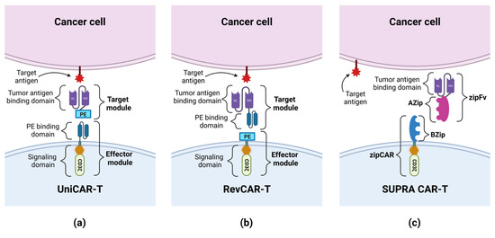 The construction of UniCAR, RevCAR and SUPRA CAR: (a) UniCAR consists of a universal effector module (EM) and a tumor-specific target module (TM). EM is composed of a signaling domain and a peptide epitope-binding domain. TM is composed of a peptide epitope (PE) and a tumor antigen-binding domain. The administration of TMs targets the UniCAR cell to the tumor cell, and enables the activation of cytotoxic mechanisms. (b) RevCAR consists of a universal EM and a tumor-specific target module (RevTM). EM is composed of a signaling domain and a peptide epitope (PE). TM is a bispecific target module composed of 2 scFvs: a peptide epitope-binding domain and a tumor antigen-binding domain. The administration of RevTM targets the RevCAR cell to the tumor cell, and enables the activation of cytotoxic mechanisms. (c) SUPRA CAR consists of a universal receptor with a leucine zipper adapter (zipCAR), and scFv with a leucine zipper adapter (zipFv) molecule, directed against the target antigen. A leucine zipper (AZip), linked to scFv, can link to the cognate a leucine zipper (BZip) present on the zipCAR. The zipFv binding to the target antigen and dimerizing with the zipCAR results in the activation of the SUPRA CAR cell. The administration of the zipFv targets the SUPRA CAR cell to the tumor cell, and enables the activation of cytotoxic mechanisms.
