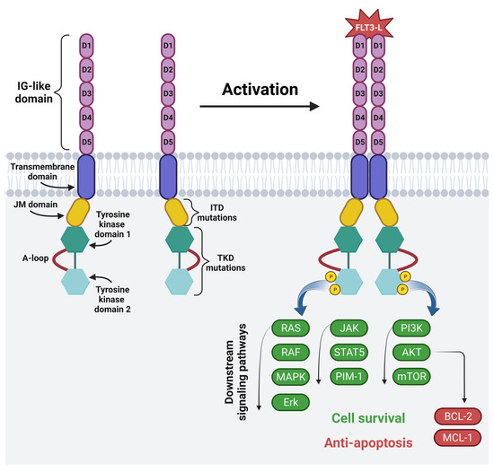 The FMS-like tyrosine kinase (FLT3) is a membrane-bound glycosylated protein and a member of the class III receptor tyrosine kinase family [71,72]. FLT3 is involved in normal hematopoiesis by controlling cell survival, proliferation and differentiation [71,72,73]. It is mainly expressed on HSCs and myeloid cells, but it is also expressed on blasts in 54–92% of AML patients [24,34,71,73]. The mutations of the FLT3 gene located on chromosome 13 are often present in AML patients, and among them ITD occurs in 15–30% of patients, and a mutation in the tyrosine kinase domain (TKD) occurs in 5–10% of patients. These mutations lead to the continuous activation of the FLT3 receptor, leading to the increased survival and proliferation of leukemic cells [73]. This, in turn, is associated with a poor prognosis and a high risk of leukemia recurrence, especially in the case of ITD, for which the five-year event-free survival is 12% and the OS amounts to 16.6% [74]. The structure and mechanism of the activation of the FLT3 receptor is shown in Figure 4.