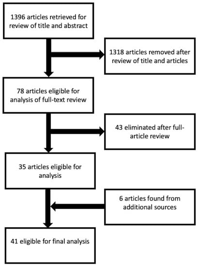 The search was conducted with a start date of the studies on 31 January 2003 to 31 January 2023. An initial search of the literature retrieved 1396 results, 1318 studies were excluded after reviewing the titles and abstracts. Seventy-eight were considered eligible for analysis, but forty-three were eliminated upon full-text review. We retrieved six articles from an additional search of the reference lists of related articles. Finally, the remaining 41 studies were included in the review (Figure 1).
