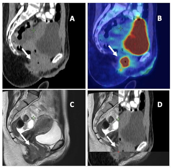 Anal cancer on different imaging modalities. (A) Computed tomography (CT). (B) 18-F-fluorodeoxyglucose positron emission tomography CT. (C) Magnetic resonance imaging (MRI). (D) a combination of CT and MRI. White arrow: primary tumor of anal canal.
