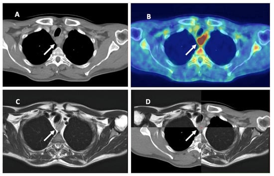 Esophageal cancer on different imaging modalities. (A) Computed tomography (CT). (B) 18-F-fluorodeoxyglucose positron emission tomography CT (FDG-PET/CT). (C) Magnetic resonance imaging (MRI). (D) combination of CT and MRI. White arrow: primary tumor of the esophagus.
