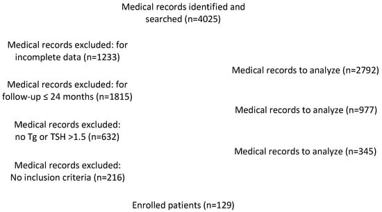 Between 2013 and 2018, 4025 consecutive patients with PTC underwent total or near-total thyroidectomy in our institution. Among these, we excluded 615 patients with incomplete data or incomplete follow-up and a total of 345 patients, which matched the exclusion criteria, as reported in Figure 2. Therefore, 129 patients (30 males and 99 females; mean age: 57.86 ± 13.24 years) with complete follow-up and verified clinical and serological data were included in this study.