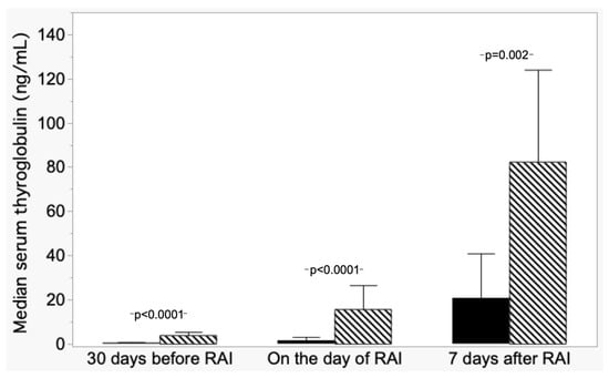 - Lin, J.D.; Huang, M.J.; Hsu, B.R.; Chao, T.C.; Hsueh, C.; Liu, F.H.; Liou, M.J.; Weng, H.F. Significance of post-operative serum thyroglobulin levels in patients with papillary and follicular thyroid carcinomas. J. Surg. Oncol. 2002, 80, 45–51. [Google Scholar] [CrossRef] [PubMed]
