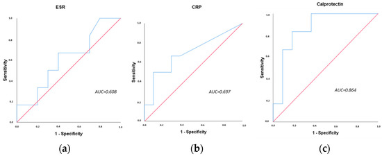 We studied the discriminatory capacity of serum calprotectin to identify patients with active inflammatory activity in the group of patients with irAEs and compared it with the acute-phase reactants. We found that ESR and CRP had moderate discriminatory capacity to identify patients with inflammatory activity, with AUC values of 0.608 and 0.697, respectively (Figure 3a,b). However, serum calprotectin had a very good discriminatory capacity with an AUC of 0.864 (Figure 3c).