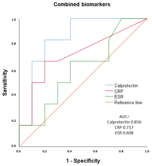 The performance of the three biomarkers combined (calprotectin, ESR, and CRP) did not increase the sensitivity of the single calprotectin determination (Figure 4).