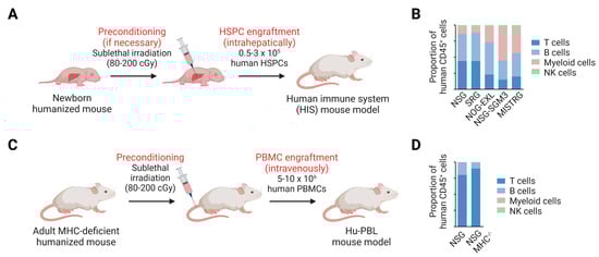 Establishment of human immune system (HIS) mouse models. (A) Immunodeficient mice can be reconstituted with a human immune system. For this purpose, newborn mice (1–5 days old) are preconditioned (e.g., sublethal irradiation, busulfan treatment). Some humanized mouse strains, such as NSG-W41, NRG-W41, B6RGSNOD-K, MISTRG and MISTRG-6 mice, do not need to be preconditioned. Human HSPCs are injected into the liver of newborn mice, which leads to the development of a human immune system. (B) The bar graph illustrates the composition of the human immune system in five different humanized mouse models 10–14 weeks post-engraftment with fetal/neonatal HSPCs [14,149,150]. The development, composition and function of the human immune system depends on the humanized mouse model and the source of HSPCs. Fetal and neonatal HSPCs (fetal liver, umbilical cord blood) engraft ≥ 3-fold better than adult HSPCs (bone marrow, G-CSF-mobilized blood) [18,143]. (C) MHC-deficient humanized mice can be preconditioned and intravenously engrafted with human PBMCs. (D) The bar graph illustrates the composition of human immune system in NSG and MHC-deficient NSG mice 4 weeks post-engraftment with human PBMCs [144]. Abbreviations: cGy, centigray; G-CSF, granulocyte colony-stimulating factor; HSPC, hematopoietic stem and progenitor cell; Hu-PBL, human peripheral blood lymphocyte; MHC, major histocompatibility complex; NK cell, natural killer cell; PBMC, peripheral blood mononuclear cells.