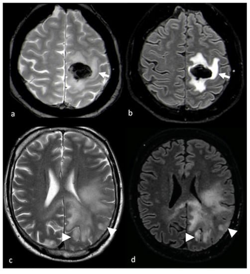 Conventional and advanced MRI techniques have added valuable information in the diagnosis, characterization and prognosis of brain tumors [1]. Nevertheless, their application in the assessment of the enhancing part of the tumor has shown limitations in the achievement of sufficient accuracy for precise histological diagnosis and prognosis in the follow up [2,3]. Therefore, some authors have paid attention to the non-enhancing peritumoral area (NEPA), which is defined as the high-signal-intensity region in T2-weighted and fluid-attenuated inversion recovery (FLAIR) images surrounding tumoral lesions. The NEPA corresponds to a wide range of different pathological processes, including edema, and can involve local changes in vessels and cellular membrane permeability, peritumoral infiltration of neoplastic cells and necrosis, inflammation and gliosis [4,5]. The analysis of the NEPA has been demonstrated to be useful for the differential diagnosis of contrast-enhanced brain tumors, such as high-grade gliomas (HGGs), brain metastases (BMs) and primary central nervous system lymphomas (PCNSLs). Furthermore, the prognostic value of the extent and imaging characteristics of the NEPA from preoperative MRI has been explored, revealing a correlation with overall survival in patients with glioblastoma [6]. Additionally, the evaluation of the NEPA may help in the follow up of treated brain tumors in order to assess the presence of residual or recurrent tumors and in the differential diagnosis of tumor progression and treatment related changes; in particular, in HGGs, where the tumor infiltration is often beyond the contrast-enhanced area so that some authors suggest considering the NEPA as a non-enhancing portion of the tumor [7].