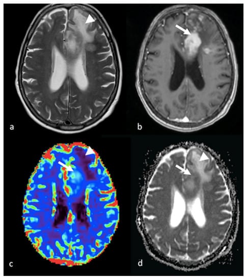 - Weber, M.A.; Zoubaa, S.; Schlieter, M.; Juttler, E.; Huttner, H.B.; Geletneky, K.; Ittrich, C.; Lichy, M.P.; Kroll, A.; Debus, J.; et al. Diagnostic performance of spectroscopic and perfusion MRI for distinction of brain tumors. Neurology 2006, 66, 1899–1906. [Google Scholar] [CrossRef]