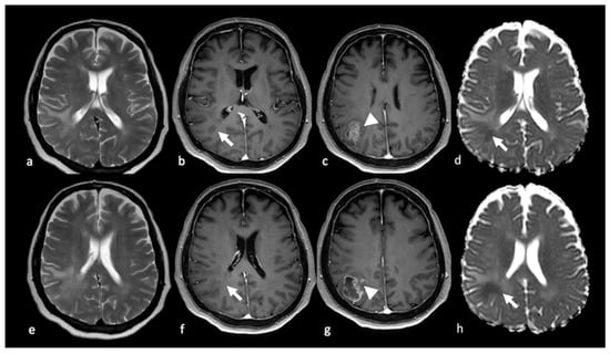 DWI of right parietal HGG: (a,e) axial T2-weighted image (b,c,f,g); axial postcontrast T1-weighted image; and (d,h) ADC map from DWI study showing a right parietal lesion with peripheral (ring) enhancement and NEPA with low ADC (white arrows) outside the contrast-enhanced lesion’s border (arrowhead), suggesting an infiltrative pattern for the HGG. DWI: diffusion-weighted imaging; HGG: high-grade glioma; ADC: apparent diffusion coefficient; NEPA: non-enhancing peritumoral area.