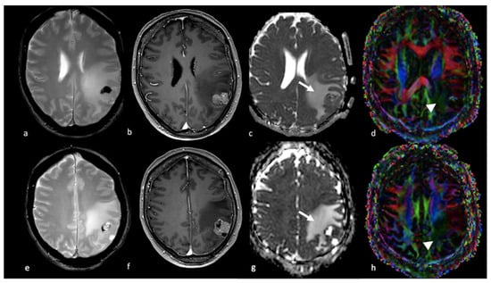DTI has been applied in the study of NEPAs with some contradictory findings. MD was reported to be higher and FA lower within the NEPAs of BMs when compared with NEPAs of HGGs. This can be explained by the more extensive and severe vasogenic edema surrounding cerebral metastases: the increase in extracellular fluid leads to the increase in the diffusion of water molecules in every direction (MD) and, at the same time, the decrease in the directionality (anisotropy) of water diffusion, resulting in a reduction in FA values [21]. Nevertheless, other authors reported lower FA values in NEPAs associated with HGGs than in NEPAs associated with BMs due to the tumoral infiltration of white fibers [27]. Figure 4 and Figure 5 illustrate DTI studies with patients with BMs and HGGs, respectively.