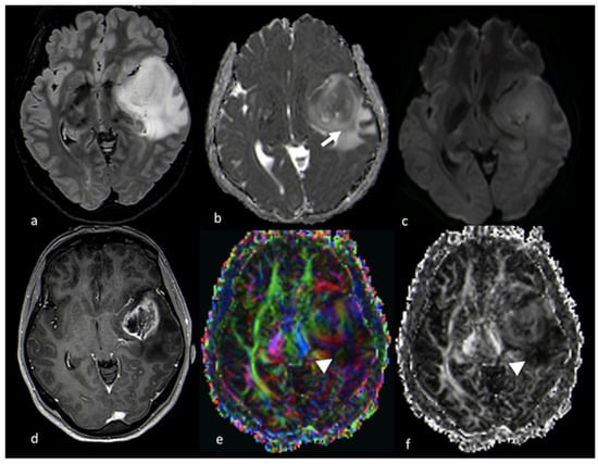 Diffusion imaging in left temporo-insular HGG: (a) axial FLAIR T2-weighted image; (b) ADC map from DWI study; (c) isotropic DWI images; (d) axial postcontrast T1-weighted image; (e) DTI FA color map; and (f) FA map from DTI study showing a left parieto-insular lesion with low ADC that extends over the contrast-enhanced rim (white arrow). The DTI study shows a decrease in FA values in the NEPA due to tumoral infiltration of white matter fibers (arrowhead). HGG: high-grade glioma; ADC: apparent diffusion coefficient; DWI: diffusion-weighted imaging; DTI: diffusion tensor imaging; FA: fractional anisotropy; NEPA: non-enhancing peritumoral area.