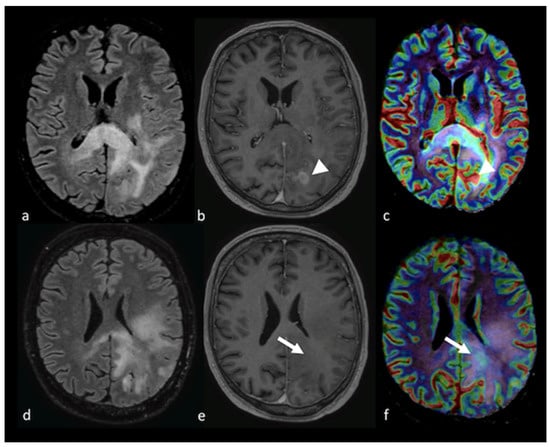 Analyses of MR perfusion patterns in the NEPA have shown more coherent results than those of the perfusion patterns for the enhancing tumors in the differential diagnosis of HGGs and BMs. DSC perfusion studies demonstrated that rCBV in the NEPA is higher for glioblastomas than for BMs [18,46,47,48,49,51,52], and that its performance in discriminating HGGs and BMs is better than that of the rCBV in the solid part of the tumor, with different diagnostic accuracies reported in the literature. Askaner et al. found areas under the curve (AUCs) of 0.74 and 0.68, respectively, with normalized rCBV threshold values of 1.56 for NEPA and 3.75 for the enhancing region [48], while Neska-Matuszewska et al. reported a higher accuracy of 0.94 for a max rCBV cutoff value of 0.98 in the peritumoral zone [47] and no significant differences for the max rCBV within the enhancing tumor. A positive predicting value of 68% and a negative predicting value of 95% for normalized rCBV (cutoff value of 1) in the NEPA was reported by Blasel et al., suggesting than BMs can be reliably excluded if the rCBV is increased in the NEPA while, conversely, a decreased rCBV may not exclude HGGs [53]. These findings probably reflect the different histological characteristics of NEPAs in HGGs and BMs: the hypoperfusion of peritumoral edema in BMs is the result of vasogenic edema due to plasma fluid leakage and local compression of the microcirculation caused by the edema itself [54,55], while the moderate hyperperfusion reported in the non-enhancing area around HGGs is the consequence of infiltrative neoangiogenesis and increased neoplastic cellularity [56]. Moreover, the direct relationship between perfusional values and tumor cell density in the peritumoral T2 hyperintensity region has been demonstrated in murine models of glioblastomas [57]. In contrast, the solid enhancing tumor part is probably more similar in HGGs and BMs, both presenting angiogenesis and blood–brain barrier breakdown [58]. The patterns of PWI in NEPAs in HGG and BM patients are shown in Figure 6 and Figure 7, respectively.