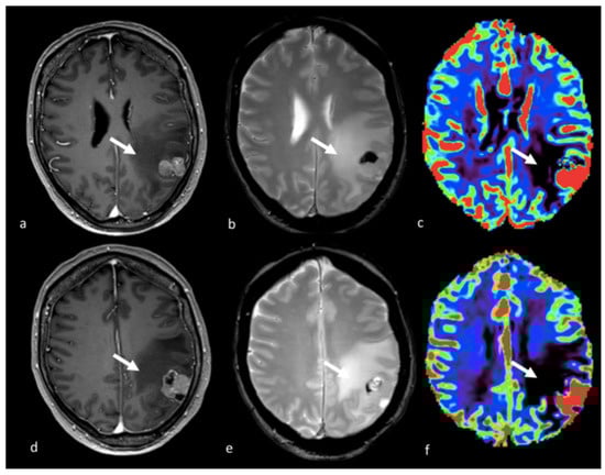 PWI in right parietal HGG: (a,d) axial T2-weighted image; (b,e) axial postcontrast T-1 weighted image; (c) Vp map from DCE study; (f) CBV map from DSC perfusion study. Right parietal lesion with irregular enhancement, cystic component and large NEPA. In the Vp map (c), ROI 1 positioned in the NEPA (arrowhead) shows a higher value compared to ROI 2 positioned in the contralateral normal-appearing white matter (ROI 1 Vp = 4.412 × 10−3; ROI 2 Vp = 0.276 × 10−3). The CBV map (f) shows an increase in the CBV value (white arrow) in the NEPA compared to the contrast-enhanced area, suggesting an infiltrative pattern. This case is also shown in Figure 3. PWI: perfusion-weighted imaging; HGG: high-grade glioma; Vp: volume of plasma; DCE: dynamic contrast-enhanced; CBV: cerebral blood volume; DSC: dynamic susceptibility contrast-enhanced; NEPA: non-enhancing peritumoral area; ROI: region of interest.