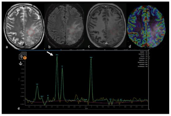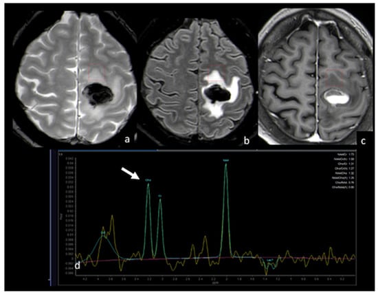 - Ricci, R.; Bacci, A.; Tugnoli, V.; Battaglia, S.; Maffei, M.; Agati, R.; Leonardi, M. Metabolic findings on 3T 1H-MR spectroscopy in peritumoral brain edema. AJNR Am. J. Neuroradiol. 2007, 28, 1287–1291. [Google Scholar] [CrossRef]