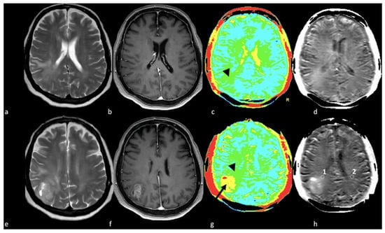 In contrast, Lin et al. found no significant differences between tumoral CBFs in HGGs and BMs, while the peritumoral CBF was higher in glioblastomas. Interestingly, they explored the gradient of CBF values within the peritumoral T2 hyperintense area from the region close to the tumor to the region distant from the tumor border, showing that the CBF gradient was able to discriminate HGGs and BMs well with a cutoff value of 1.92 mL/100 g, sensitivity of 92.86% and specificity of 100.00% [66]. The steeper CBF gradient observed in HGGs reflects the gradient of tumoral cell infiltration, which decreases from the central to peripheral T2 hyperintense area [67,68]. Additionally, the CBF gradient in the peritumoral area was more accurate than the ADC gradient in discriminating HGGs from BMs. Figure 9 displays a case of BM with low values for the CBF in the NEPA.