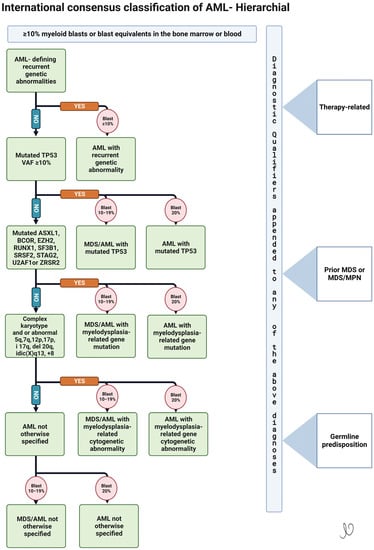 - Khoury, J.D.; Solary, E.; Abla, O.; Akkari, Y.; Alaggio, R.; Apperley, J.F.; Bejar, R.; Berti, E.; Busque, L.; Chan, J.K.C.; et al. The 5th edition of the World Health Organization Classification of Haematolymphoid Tumours: Myeloid and Histiocytic/Dendritic Neoplasms. Leukemia 2022, 36, 1703–1719. [Google Scholar] [CrossRef] [PubMed]