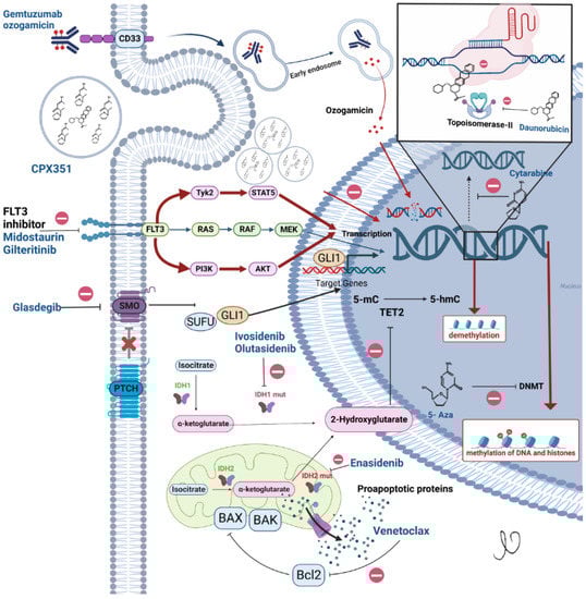 - Madanat, Y.; Nazha, A. Novel and Investigational Therapies in Acute Myeloid Leukemia. In Acute Leukemias; Springer: Berlin/Heidelberg, Germany, 2021; pp. 133–144. [Google Scholar] [CrossRef]