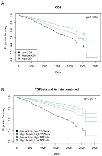 Activin signaling is required for the TGFβ stimulation of metastasis of CRC cells, indicating significant cross-talk in the tumor microenvironment (TME) [4,33]. Thus, we performed IHC staining and scoring for activin, TGF-β, and CD4 on 1055 stage II/III CRC patient samples from the QUASAR II cohort to correlate changes in survival to pan-tumoral expression of these markers. Histopathological analysis of 990 CRC patient tumor samples revealed increased overall CD4 expression in the TMA, which was associated with a significant increase in survival time (chisq(1) = 7.2973, p = 0.0069). Additionally, higher CD4 expression in the tissue was associated with lower hazard of mortality (HR = 0.5326, 95% CI from 0.3343 to 0.8483, comparing CD4 = 0 to CD4 = 2, p = 0.0080). Estimated probability of survival at 5 years was 71.84% for low CD4 (i.e., CD4 = 0, 95% CI from 65.10% to 79.28%) and 83.85% for high CD4 (i.e., CD4 = 2, 95% CI from 78.34% to 89.74%) (Figure 2A). Activin (n = 1042) and TGF-β (n = 971) together significantly predicted survival (chisq(3) = 9.687, p = 0.0214). The combination of low activin (activin = 0) and low TGF-β (TGF-β = 0) was associated with the lowest estimated probability of survival at 5 years (60.86%, 95% CI from 47.74% to 77.57%). This was significantly lower than the combinations of high activin (activin = 2) and high TGF-β (TGF-β = 2, estimated probability of survival 86.73%, 95% CI from 78.43 to 95.91, p = 0.0054), high activin and low TGF-β (82.87%, 95% CI from 76.14% to 90.18%, p = 0.0031), or low activin and high TGF-β (86.74%, 95% CI from 78.43% to 95.92%, p = 0.0035). No other pair of combinations significantly differed from each other (Figure 2B). Taken together, a lack of expression in both ligands conferred the worst outcome, with one ligand alone being able to rescue this effect. Therefore, counter to our initial hypothesis, in CRCs without distant metastasis, low activin in combination with low TGF-β was associated lower survival, while patients with tumors with high activin and low TGF-β fared significantly better. Representative IHC images can be found in Supplemental Figure S3.