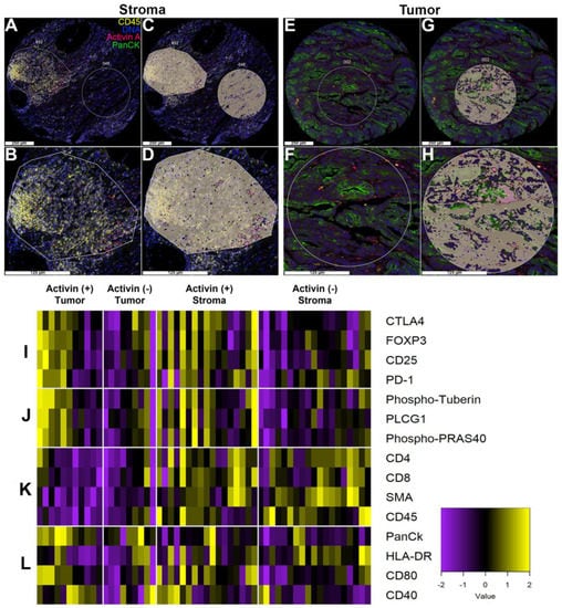 Activin plays a direct role in T-cell stimulation in the context of lung cancer through ACVR1 [15]. To further explore the role for activin signaling in the TME and to identify if any easily identifiable trends were observed across activin (+) and (−) AOIs across tumoral and stromal compartments, a heatmap was generated and separated into 4 parts (Figure 3I–L, n = 8, 10, 18, and 20). The heat signature was increased in the activin (+) AOIs in both the tumoral and stromal compartments indicating an increase in proteins implicated in T-cell exhaustion (Figure 3I) and PI3K/AKT signaling (Figure 3J). Markers of stromal tissue (ɑ-SMA) and immune cells (CD45, CD4, CD8) were elevated in the samples labeled as such, validating the separation of samples and the quantitative method (Figure 3K). Furthermore, PanCK had the highest heat signature in the tumor samples independent of activin co-localization, further validating the data set (Figure 3L). Interestingly, activin (−) stromal AOIs had the highest heat signature for HLA-DR (MHCII), which is found on antigen-presenting cells (APCs); however, proteins that are implicated in APC activation were greatest in activin (+) AOIs (Figure 3L). These data suggest that tissue compartments were successfully separated and that activin polarizes immune cell signatures through the PI3K pathway.