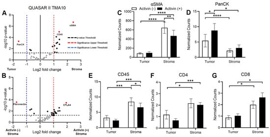 Markers of tumoral and stromal compartments confirm successful segregation of regions via DSP with an increase in CD45 observed in activin (−) regions of the stroma. (A) Volcano plot indicating that several proteins, including CD45, α-SMA, and PanCK, are significantly differentially expressed across the tumoral and stromal compartments in the TME. (B) Volcano plot displaying several proteins that are significantly differentially expressed in the stromal compartment of the TME, which is dependent upon activin co-localization. Analysis of the CRC tissue sections across activin (+) and (−) areas within tumoral and stromal compartments identified significant changes in expression of several proteins found in the stroma and tumor of the TME, including (C) ɑ-SMA, (D) PanCK, (E) CD45, (F) CD4, and (G) CD8. Data were analyzed via linear mixed modeling with Benjamini–Hochberg multiple-correction test (* p < 0.05, ** p < 0.01, *** p < 0.001, **** p < 0.0001, n = 8, 10, 18, and 20).