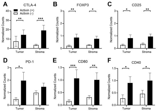 There has been conflicting evidence surrounding the effect of activin on T-cell polarization [14,15]; however, activin appears to promote macrophage activation [12,13], suggesting a critical role for this cytokine in inflamed tissue. Therefore, several markers of T-cell and APC activation status were included in our panel of quantified proteins (see Supplemental Table S1) to determine how activin influences immune cell phenotyping in the TME. The normalized data revealed that the activin (+) compartment displayed a significant increase in several markers of T-cell exhaustion including CTLA-4, FOXP3, and CD25 (Figure 5A–C). Additionally, an increase in PD-1 was only observed in activin (+) tumor samples when compared to activin (−) tumor samples with no significant changes observed in the stroma (Figure 5D). Interestingly, these effects were coupled with an increase in markers of APC activation including CD80 and CD40 (Figure 5D,E). This may result in an increase in APC activity in activin (+) AOIs; however, this is dependent upon the T-cell antigen it interacts with (i.e., CTLA-4 vs. CD28). These data suggest activin co-localization stimulates T-cell exhaustion and expression of activation markers on APCs in both the tumoral and stromal compartments of the TME. A summary of the results can be found in Supplemental Tables S2 and S3.