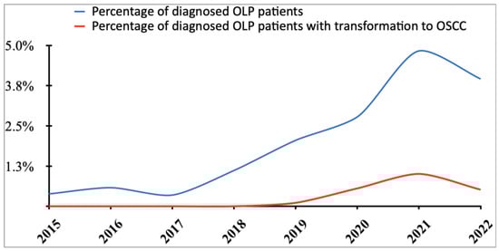 - Tsushima, F.; Sakurai, J.; Uesugi, A.; Oikawa, Y.; Ohsako, T.; Mochizuki, Y.; Hirai, H.; Kayamori, K.; Harada, H. Malignant transformation of oral lichen planus: A retrospective study of 565 Japanese patients. BMC Oral Health 2021, 21, 298. [Google Scholar] [CrossRef]