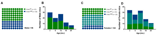 Study population. The proportion of genotypes between male (A,B) and female mice (C,D), with the respective distribution by the five age groups. Green means P.AtrxWT, teal means P.AtrxHET, and ocean blue means P.AtrxHOM (A–D). Mice’ ages were calculated by the time of death.
