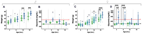 A total of 772 weighings, from 217 animals, were considered and distributed along four age groups (3, 6, 12, and 18 mo.); all the available non-longitudinal weights obtained during DOD were also included. Blood glucose levels were obtained at the same time points, and 207 measurements (from 107 animals) were used for data analysis. Ageing contributed to increasing weights in mice of all genotypes and the difference was statistically significant, especially during the first 12 mo. (Figure 3A,C, letters). In contrast, genotype-related differences were already perceived in 3- and 6-mo. male mice, but statistical significance was only present in the 12- and 18-mo. age groups of both males and females, as P.AtrxHOM individuals consistently presented higher weights than age-matched controls (Figure 3A,C, asterisks); during this period, most P.AtrxHOM presented a median weight corresponding to overweight or obesity.
