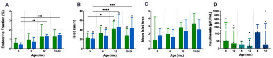 Endocrine fitness: endocrine fraction, islet count, mean islet area, and insulinaemia. Both genotype groups present an age-related increase in endocrine fraction (EF), islet count, and mean islet area (A–C). The mean islet area shows a preponderance of P.AtrxWT mice over P.AtrxKO (C). Insulinaemia assessments do not retrieve any genotype-related difference; in all genotype groups, the insulinaemia decreases from 6 mo. to 12 mo. Of note, P.AtrxHOM presents higher basal levels by 6 mo. (D). Age groups of 9, 15, and 21 mo. were included in 12 and 18–24 mo., respectively (A–D). Results are shown as the median ± IQR (A,C,D) and mean ± SD (B) * p < 0.05, ** p < 0.01, *** p < 0.001, and **** p < 0.0001. Green means P.AtrxWT (A–D), which was compared with the P.AtrxKO genotype (A–C), represented with a light blue, and with the P.AtrxHET and P.AtrxHOM genotypes coloured with teal and ocean blue, respectively (D). Triangles and circles are used to identify males and females, respectively.