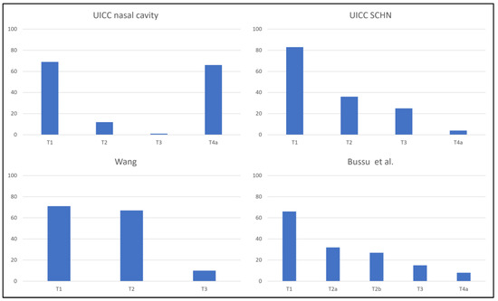 As a response to the apparent shortcomings of the current staging systems, Bussu et al. proposed a novel T-classification for CNV structured around the premise of the nasal vestibule as a separate site with a special focus on the area’s unique anatomy and the disease’s peculiar pattern of spread [23,24]. This multicenter retrospective cohort study aimed to compare the most commonly used T-staging methods with regard to stage distribution and migration.