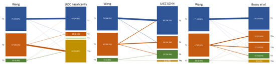 Stage migration from the Wang classification to the other staging systems. The thickness of the interconnecting lines was scaled to represent the corresponding percentage of patients. UICC = Union for International Cancer Control; SCHN = skin cancer of the head and neck.
