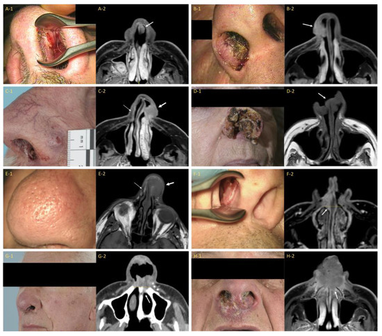 Clinical photographs and corresponding imaging studies of patients with a carcinoma of the nasal vestibule for each stage of the Bussu et al. classification. (A-1) = Patient with a left-sided T1 carcinoma of the nasal vestibule (CNV); (A-2) = Corresponding axial postcontrast T1-weighted MR image with fat saturation (T1 MR Gd FS) showing subtle soft tissue thickening on the left side of the nasal septum (white arrow); (B-1) = Patient with a right-sided T2a CNV (caudal ala); (B-2) = Corresponding axial T1 MR Gd FS image displaying the tumor invading the cutis (white arrow); (C-1) = Patient with a left-sided T2b CNV with extension through the alar cartilage to the external skin of the nose; (C-2) = Corresponding axial T1 MR Gd FS image showing cartilage invasion and an irregular skin contour (thick white arrow). Compare to the contralateral side where the normal (low signal intensity) alar cartilage is visible (thin white arrow); (D-1) = Patient with a T2b CNV with extensive tissue destruction; (D-2) = Corresponding axial T1 MR Gd FS image showing the (bilateral) tumor (white arrow); (E-1) = Patient with a left-sided T2b CNV with peau d’orange suggesting the invasion of the (sub)cutis; (E-2) = Corresponding axial T1 MR Gd FS image. Note: absence of the alar cartilage (thick white arrow). Normal (low signal intensity) alar cartilage is present on the contralateral side (thin white arrow); (F-1) = Patient with a right-sided T3 CNV; (F-2) = Corresponding axial T1 MR Gd FS image shows tumor extension (white arrow) beyond the plane of the pyriform aperture (yellow line); (G-1) = Patient with a left-sided T3 CNV; (G-2) = Corresponding axial postcontrast CT image showing extension (white arrow) beyond the plane of the pyriform aperture (yellow line); (H-1) = Patient with a T4a CNV; (H-2) = Corresponding axial T1 MR Gd FS image displaying extension of the tumor into the anterior maxilla (white arrow).