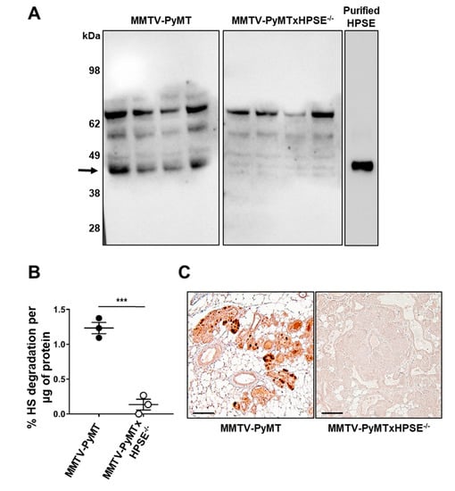 Confirmation of HPSE−/− status in MMTV-PyMT−/− mice. (A) Con-A-Sepharose bead pull down assay of whole spleen lysates of MMTV-PyMT and MMTV-PyMTxHPSE−/− mice followed by a Western blot assay indicated a prominent band of approximately 45 kDa (arrow) corresponding to enzymatically active HPSE seen only in MMTV-PyMT animals (n = 4). (B) HS degradation assay with whole spleen lysates of MMTV-PyMT and MMTV-PyMTxHPSE−/− mice showed a significant reduction in HPSE enzymatic activity in MMTV-PyMTxHPSE−/− mice (n = 3). (C) A representative image of an anti-HPSE IHC of mammary gland sections isolated from MMTV-PyMT and MMTV-PyMTxHPSE−/− mice shows a lack of HPSE expression within DCIS/invasive lesions of MMTV-PyMTxHPSE−/− mice. Scale bar = 100 μm; ***, p < 0.001, unpaired t-test. The uncropped blots are shown in Figure S5.
