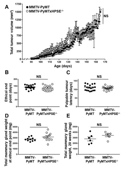 Evaluation of spontaneous mammary tumour growth between MMTV-PyMT and MMTV-PyMTxHPSE−/− mice. (A) Total mammary tumour growth rates between MMTV-PyMT and MMTV-PyMTxHPSE−/− mice were comparable; n = 20 per group. (B,C) Time to reach the ethical tumour volume end point in MMTV-PyMT and MMTV-PyMTxHPSE−/− was comparable (n = 20), as well as the time taken to develop palpable tumours (n = 18–20). (D,E) Total mammary gland weights of MMTV-PyMT and MMTV-PyMTxHPSE−/− at the ethical tumour volume end point (n = 10), as well as at 20 weeks of age (n = 6) were comparable. Error bars = SEM; NS, not significant; unpaired t-test.
