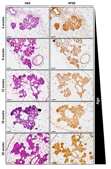 Although it is known that HPSE is overexpressed in breast cancer, it is not well understood precisely when during mammary tumour development this change occurs []. An attempt was made to determine when significant HPSE expression first became evident during the mammary tumour progression of MMTV-PyMT mice (Figure 3). Initial H&E staining of fourth inguinal mammary glands of MMTV-PyMT mice at 4, 8, 12, 16, and 20 weeks of age confirmed tumour lesions of at least hyperplasia grade. This was followed by an anti-HPSE IHC, which revealed detectable levels of HPSE expression within the lesions occurring as early as 4 weeks of age and remaining consistent over time. No significant overexpression of HPSE associated with the age of the mice was observed. Therefore, these results suggest that in MMTV-PyMT mice, tumour lesion-associated HPSE expression within the mammary glands occurs early in tumour development and remains at a steady level throughout growth.