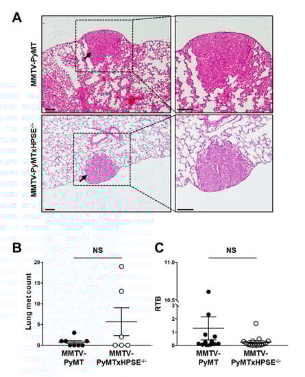 Lung metastatic burden in MMTV-PyMT and MMTV-PyMTxHPSE−/− mice. (A) Representative images of metastatic lesions (indicated by arrows) in MMTV-PyMT and MMTV-PyMTxHPSE−/− female mice lungs excised at the ethical tumour volume end point; H&E stained. (B) Visual quantification of individual metastatic lesions in serial lung sections revealed no significant difference between MMTV-PyMT and MMTV-PyMTxHPSE−/− mice (n = 6–8). (C) qPCR of MMTV-PyMT and MMTV-PyMTxHPSE−/− mouse lungs excised at the ethical tumour volume end point revealed no significant difference in RTB (n = 12–15). Scale bars = 100 μm. Error bars = SEM; NS, not significant; unpaired t-test.