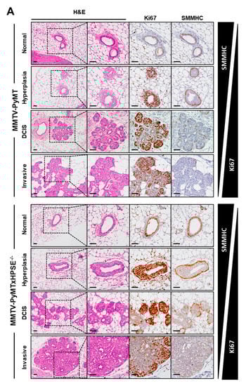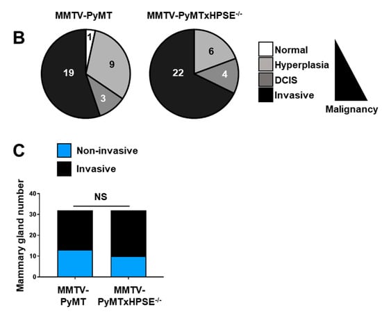 Although HPSE has been reported to promote the development of breast cancer, the precise role of HPSE in the early stages of mammary tumour development remains poorly defined. Mammary tissue sections from 6-week-old MMTV-PyMT and MMTV-PyMTxHPSE−/− mice were examined to reveal the pathological status of tumour lesions present in each mammary gland (Figure 6). The presence of lesions was first determined through H&E staining, which revealed normal mammary glands or malignant grades of hyperplasia, DCIS, and invasive carcinoma. Further staining with anti-Ki67 and anti-SMMHC antibodies distinguished between hyperplasia, DCIS, and invasive carcinoma stages (Figure 6A) []. A graphical representation shows the distribution of incidences of each major stage of breast cancer observed between all mammary glands analysed (Figure 6B). This was further expanded upon to represent the distribution between non-invasive and invasive lesions observed in each of the four mammary glands per animal analysed in this study (Supplementary Figure S3). No distinct variation in lesion grade between female MMTV-PyMT and MMTV-PyMTxHPSE−/− mice was observed. Finally, a quantitative analysis of the number of mammary glands bearing non-invasive vs. invasive mammary tumour lesions between MMTV-PyMT and MMTV-PyMTxHPSE−/− mice was carried out via a chi-square test, as previously described []. This revealed no significant variation in invasive lesion incidence between the two groups (Figure 6C). Together, these data suggest that HPSE does not play a role in promoting the progression of MMTV-PyMT mammary tumours early in their development.