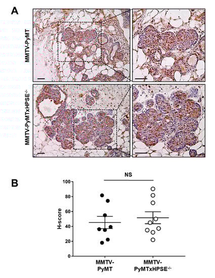 3.1. Characterisation of HPSE Expression and Activity Status of MMTV-PyMT and MMTV-PyMTxHPSE−/− Mice