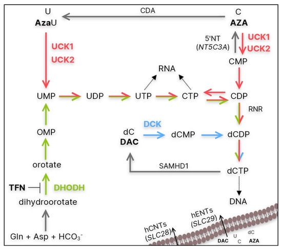 Studying possible mechanisms of resistance, we mainly focused on the uptake of HMAs and their fate in sensitive and resistant cells. Both AZA and DAC are prodrugs that must be phosphorylated to the corresponding triphosphates in order to be incorporated into DNA or RNA and exert their effects [13]. Since HMAs are cytidine and deoxycytidine analogs, they use enzymes from the pyrimidine salvage pathway for their activation (Figure 1, red and blue). This pathway is often used by cancer cells to synthesize pyrimidine nucleotides required for DNA replication and mRNA synthesis. Although this pathway is more energy efficient, cells can also use the de novo pyrimidine synthesis pathway to maintain CTP and dCTP pools (Figure 1, green) [14]. For this reason, we also focused on the potential use of de novo pyrimidine synthesis inhibition in cells with HMA resistance.
