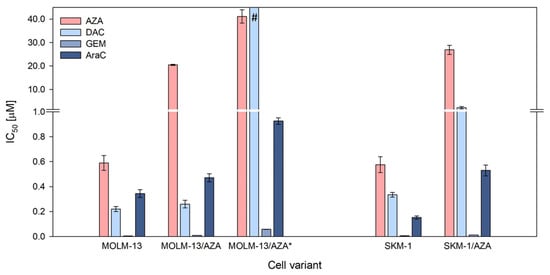Cell sensitivities to 5-azacytidine (AZA), 5-aza-2′-deoxycytidine (DAC), gemcitabine (GEM), and cytarabine (AraC) expressed as the half maximal inhibitory concentration (IC50). The IC50 was computed by nonlinear regression according to Equation (1) using SigmaPlot. The data represent computed value ± standard error with 30 degrees of freedom. # = Even at a concentration of 40 μM, DAC did not show a half-maximal inhibitory effect on the cells.