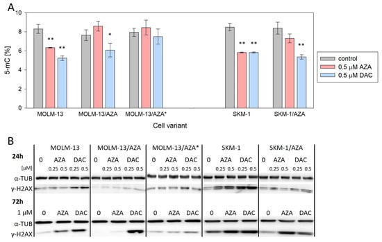 Effect of AZA or DAC on DNA-related events in the cell variants. (A) Global DNA methylation status determined by a methylated DNA quantification kit. The cells were incubated for 72 h in the presence or absence of AZA/DAC at a concentration of 0.5 μM. AZA or DAC was added to the cultivation medium every 24 h. Statistical significance is as follows: * p ≤ 0.05; ** p ≤ 0.01. (B) Protein expression of γ-H2AX determined by Western blot analysis. α-TUB was used as an internal control. The cells were incubated for 24 h in the presence or absence of AZA/DAC at 0.25 and 0.5 μM concentrations and 72 h in the presence or absence of AZA/DAC at 1 μM concentration. AZA or DAC was added to the cultivation medium every 24 h.