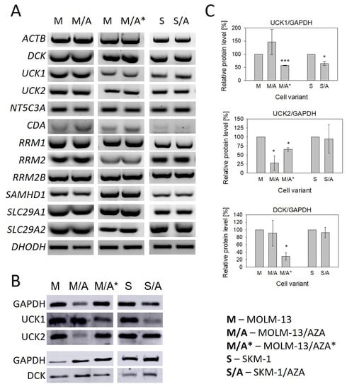 In M/A*, UCK1, UCK2, and DCK were all downregulated compared to the parental cell line at the protein level (Figure 4B,C). Neither DNA hypomethylation nor H2AX phosphorylation were considerably increased (Figure 3). Similarly, in the study by Hur et al. (2017), neither AZA nor DAC caused downregulation of DNMT1 protein expression in AZA-resistant cell variants cross-resistant to DAC [18].